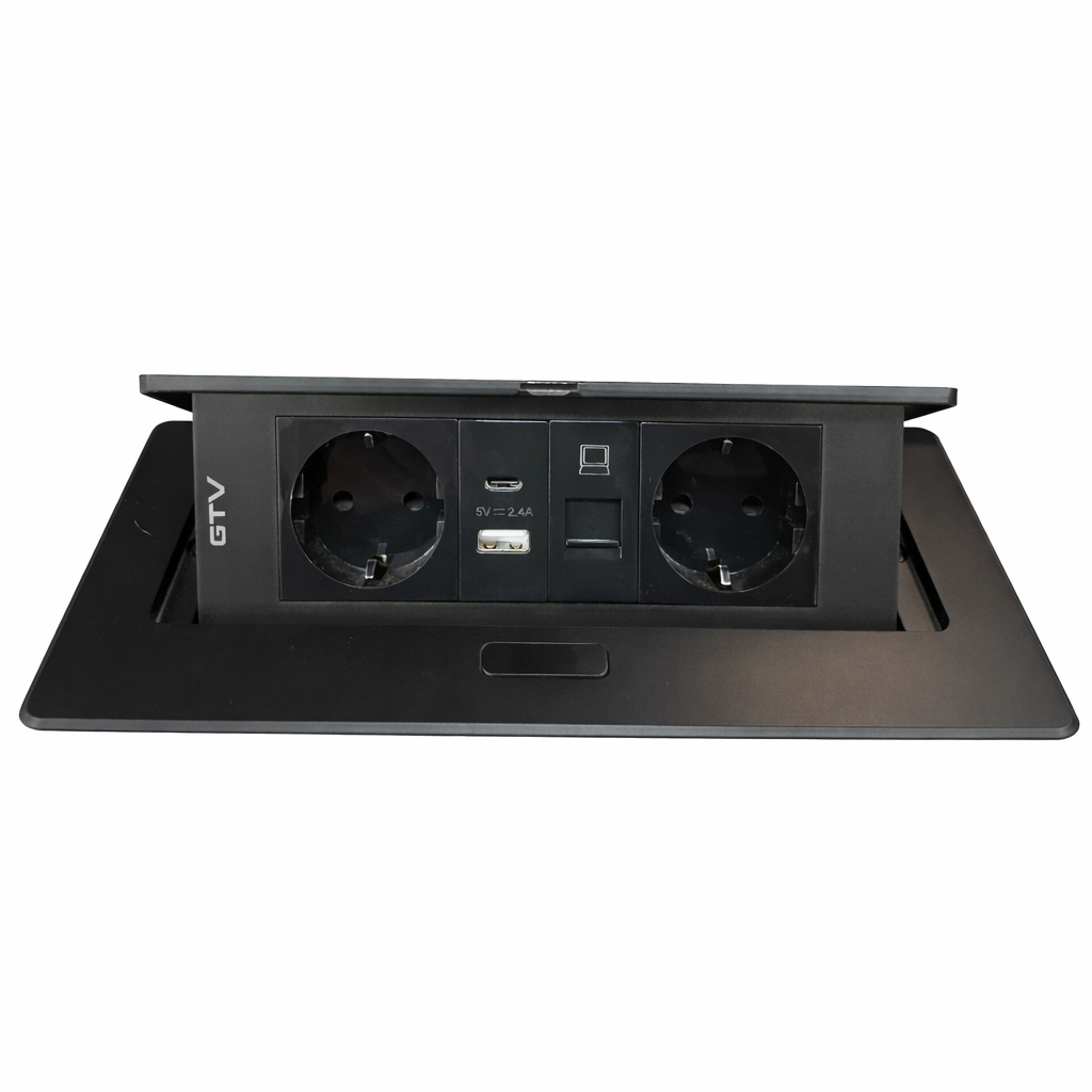 GTV ჩასაშენებელი ამოსაწევი ელექტრო ბლოკი მაგიდისთვის – 2×220V სოკეტი, USB დამტენი (5V/2.4A), LAN პორტი